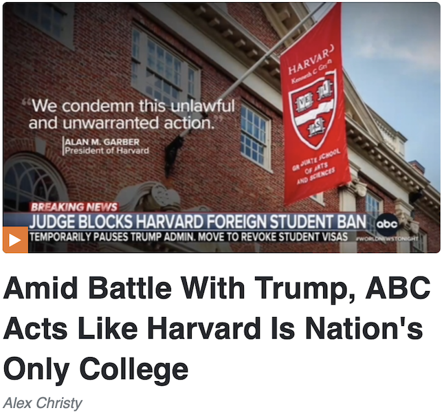 Now, Trump is using the power of the presidency to try and destroy Harvard, the MRC is totally behind that as well. Mark Finkelstein grumbled that the gambit was identified in a May 23 post: