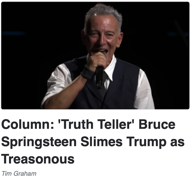 Wait several drum beats, and out came The Washington Post, with a laudatory article by pop music critic Chris Richards. The headline blared: “Bruce Springsteen is fighting for the America he sings about: On a powerful new live recording, the rock legend isn’t warning us about approaching authoritarianism. ‘This is happening now.’”