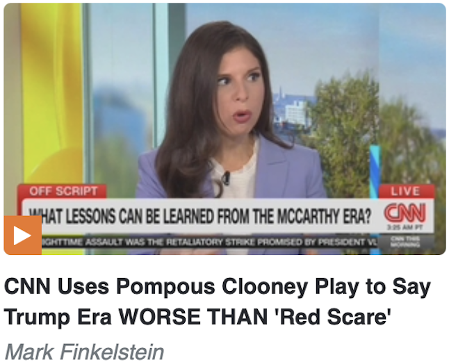 It was biased enough for CNN to air a live Broadway performance of George Clooney’s Broadway play Good Night and Good Luck,which glorifies 1950s CBS left-wing hack Edward R. Murrow attacking anti-communist Sen. Joseph McCarthy (R-Wis.) as an anti-Trump #Resistance ploy. David Marcus at Fox News called it “breathtakingly sanctimonious.”