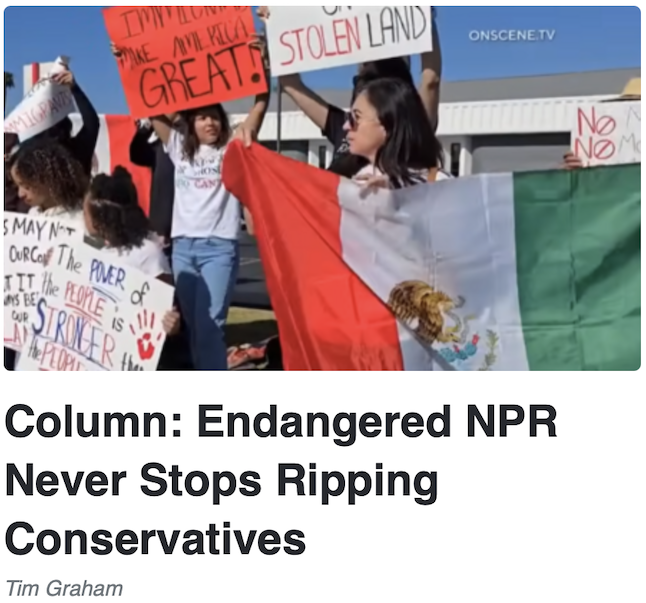 So the House Republicans voted to end taxpayer funding for PBS and NPR. NPR CEO Katherine Maher has repeatedly claimed, in the face of avalanches of evidence, that she has never witnessed any bias at NPR. That’s beyond ridiculous. You can find it, day after day, hour on the hour. This week’s Los Angeles rioting provided plenty of exhibits.