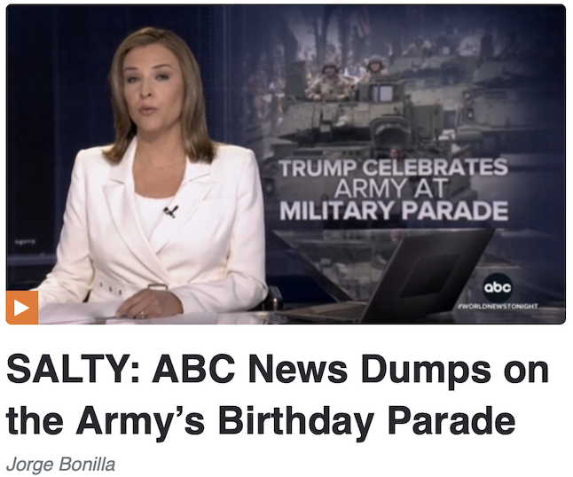 […]Stop for a second and consider this short shrift in contrast to what coverage of this parade might have looked at under a President Kamala Harris. I will note for the record that recent past Pride parades drew significantly more coverage, by orders of magnitude, than did the Army’s 250th birthday. At ABC News, Trump-deranged coverage remains the first order of business, even over the beginning of a year-long celebration of America’s freedom.
