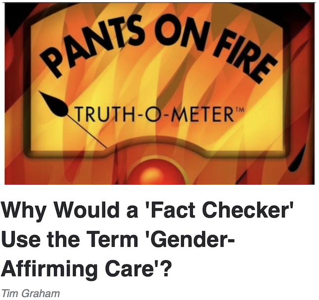 One easy test of whether a media outlet is truly “fact-based” is the claims and lingo of transgender advocates. That goes double for “independent fact-checkers.” If you call hormone blockers or amputation surgeries “gender-affirming care,” then you are using the fact-mangling rhetoric of activists, not caring for facts. These types of “care” are clearly denying the actual and factual gender. It’s like using the term “life-saving abortion.”