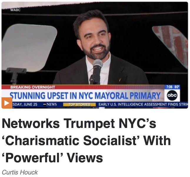 At least both co-anchor Geoff Bennett and field reporter William Brangham called Mamdani a “socialist,” though the label would be hard to deny, given Mamdani is running under the party line of the Democratic Socialists of America. Even the New York Times editorial page fretted that Mamdani, a NYC Assemblyman representing Queens, “offers an agenda that remains alluring among elite progressives but has proved damaging to city life.”