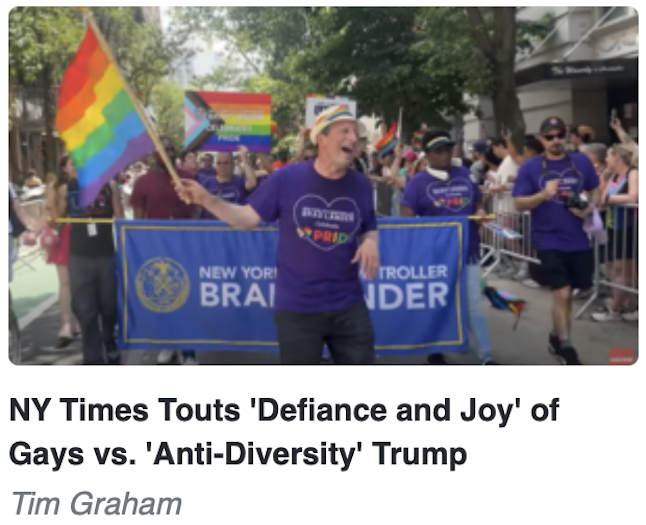The Times wants to argue liberal bias is winning: “The New York march is the largest of its kind in the United States, with 75,000 participants and roughly two million spectators, according to organizers. It is also broadcast on network television, a testament to how much public support for L.G.B.T.Q. people has grown over a generation.” The parade is apparently broadcast live on ABC’s New York City station.