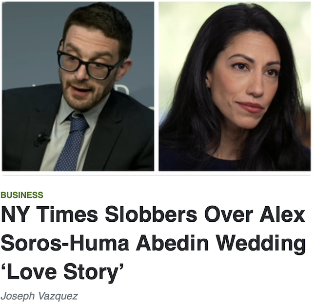 Need more evidence to prove how much influence the Soros empire wields over the media? Then The New York Times’s, er, heart-throbbing excuse for a news item over crown prince Alex’s wedding to corrupt former Hillary Clinton aide and disgraced former Congressman Anthony Weiner’s ex-wife Huma Abedin could probably serve as Exhibit A.