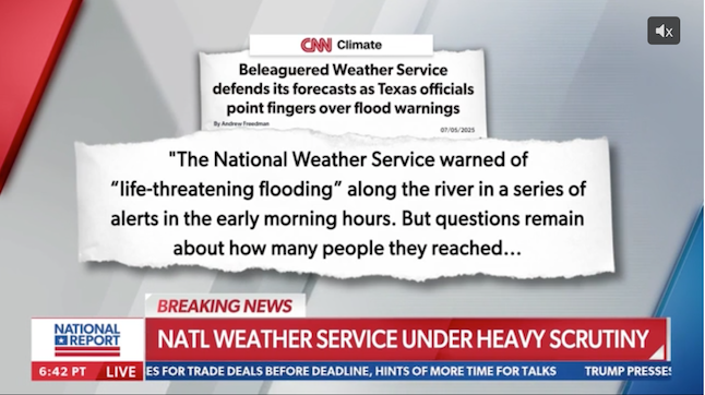 There was also an article by Jim Thomas noting that “Senate Minority Leader Chuck Schumer requested Monday that the Commerce Department’s inspector general investigate whether recent staffing changes at the National Weather Service hindered forecasts and emergency warnings during last week’s catastrophic flooding in Central Texas,” but making sure to add that “The NWS defended its forecasting capabilities and insisted that it had effectively issued urgent flash flood warnings in the hours leading up to the rapid rise of the waters.”