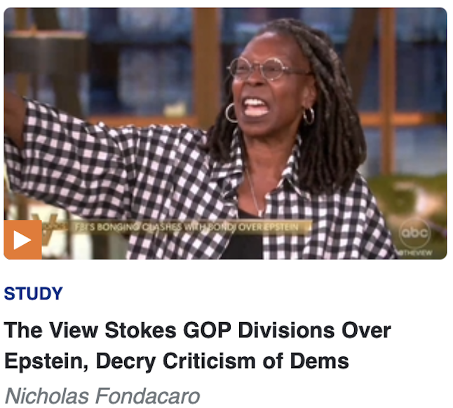 The Media Research Center believes that anything that makes President Trump look bad is not worthy of media coverage — witness its complaints about coverage about the Trump-Elon Musk feud. So when the Jeffrey Epstein scandal resurfaced, more complains about coverage were inevitable. Nicholas Fondacaro groused in his July 9 hate-watch of “The View”: