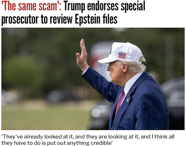 “I think they could look at all of it. It’s all the same scam. They could look at this Jeffrey Epstein hoax also, because that’s the same stuff that’s all put out by Democrats,” he said. Asked about a look at Epstein, he said, “They’ve already looked at it, and they are looking at it, and I think all they have to do is put out anything credible.”
