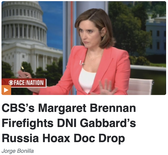 Across the legacy media Sunday dial, there was just one mention of the explosive declassification and publication of documents related to the Russia Hoax by Director of National Intelligence Tulsi Gabbard. Rest assured, it wasn’t a bipartisan panel segment or an interview with Gabbard- but CBS’s Margaret Brennan bringing on the ranking House Intel Democrat in order to firefight the release and subsequent actions.