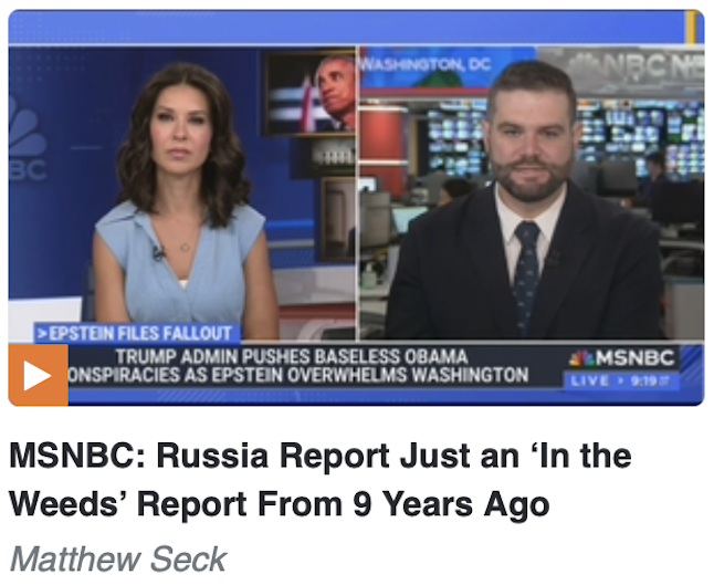 The online headline was loaded, linking the resurfacing of Russiagate to the ongoing imbroglio over sex trafficker Jeffrey Epstein: “Gabbard pushes report on Obama and Russia probe as Trump faces pressure over Epstein.” Host Geoff Bennett’s introduction was certainly “sowed with doubt” regarding Gabbard’s revelations.