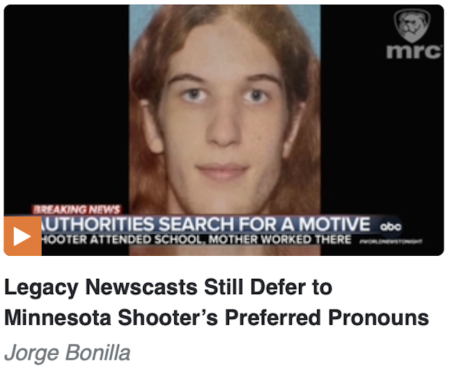The Media Research Center continued to obsess over the Minnesota school shooter’s transgender identity — and whine that non-right-wingers were talking about the guns — in an Aug. 29 post by Jorge Bonilla:
