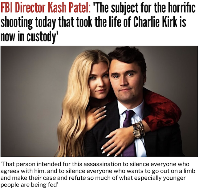 WND also served as stenographer for law enforcement. One article hyped the recovery of the alleged murder weapon, followed by an article that originally parroted FBI director Kash Patel’s declaring that the shooter had been arrested but was later rewritten to admit that wasn’t the case. Bob Unruh cranked out another related article: