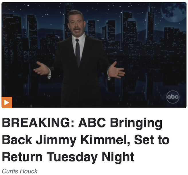 As reported by Ben Mullin of The New York Times, Nexstar has just issued its statement announcing that they will continue to pre-empt Jimmy Kimmel Live! “pending assurance that all parties are committed to fostering an environment of respectful, constructive dialogue in the markets we serve.”