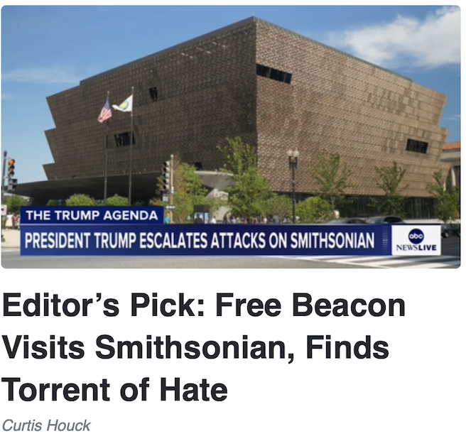 In a story published on Monday for Labor Day, Washington Free Beacon reporter Jonathan Levine visited the Smithsonian African-American History Museum for what became an incredibly disturbing encapsulation of the hateful bias and woke ideology President Trump and his administration face as it seeks to ensure the government-funded museums “celebrate American exceptionalism” and not symbolize “the last remaining segment of ‘WOKE.’”