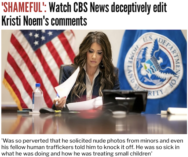 CBS News, which has a history of deceptively editing interviews of high-profile newsmakers, is being blasted by U.S. Homeland Security Secretary Kristi Noem for editing out her descriptive comments about MS-13 gang member, wife beater and child predator, Kilmar Abrego Garcia.