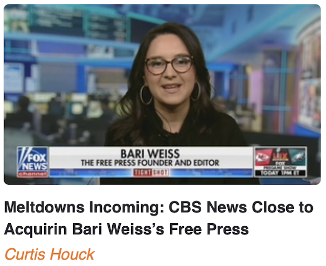 Jorge Bonilla hyped the rumor a day before, adding, “Bari Weiss can’t get to CBS quickly enough.” The next day, Houck promoted new rules at CBS about interviews, concluding: “Between this, the long-rumored purchase of The Free Press, and granting Free Press founder Bari Weiss a senior CBS News role, the liberal media could be on the verge of losing one of the ‘Big Three’ to reality.”