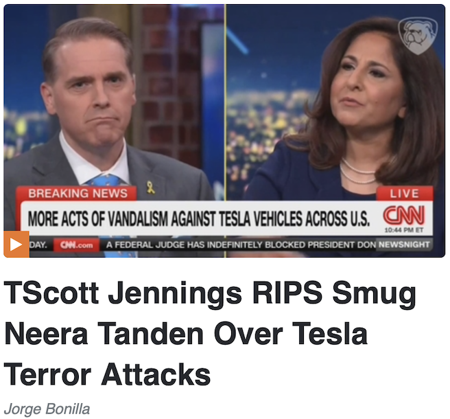 On CNN NewsNight with Abby Phillip, Democrat apparat and failed Biden OMB nominee Neera Tanden tried to conflate the leftist terror attacks against Tesla vehicles and facilities with the January 6th Capitol Riot. Conservative commentator Scott Jennings had none of it.