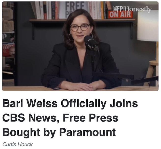 In word first leaked out Wednesday afternoon to the New York Post, Puck’s Dylan Byers, and others, Paramount Skydance will reportedly announce as soon as Monday it will not only acquire the great team running The Free Press, but make its founder Bari Weiss the editor-in-chief of CBS News, triggering a hopeful avalanche of changes to the ratings-challenged legacy liberal network at a time of record-low trust in the press.