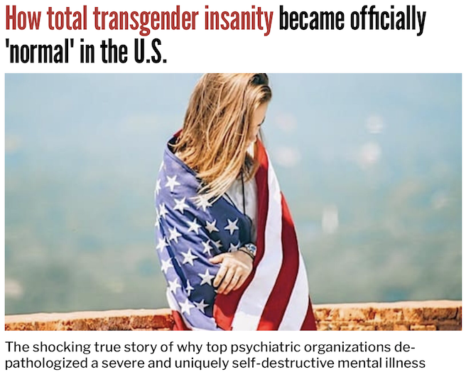 Indeed, the 2013 renaming of “gender identity disorder” as “gender dysphoria,” thanks to relentless pressure from the powerful and epically intimidating LGBT lobby, means the condition itself is no longer considered abnormal or “disordered” at all, but only the anxiety (“dysphoria”) one may feel over it – anxiety that LGBT apologists blame almost entirely on public ignorance, intolerance and bigotry.