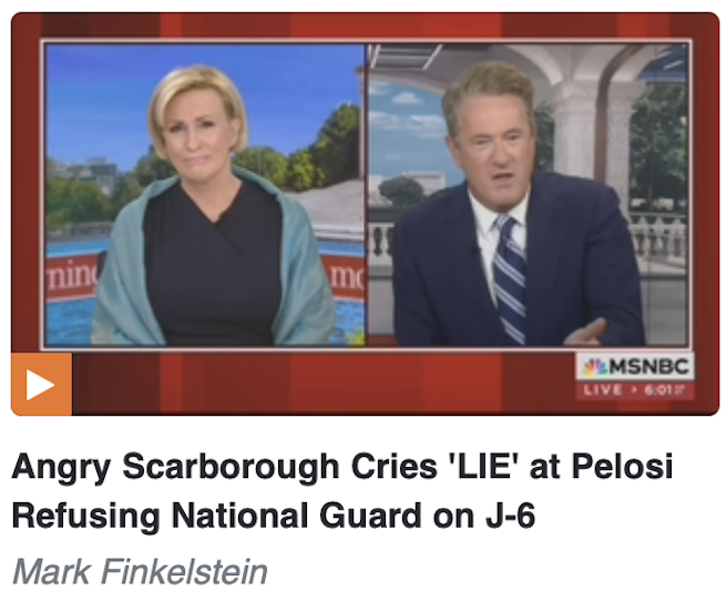 Joe Scarborough opened Thursday’s Morning Joe by going on a lengthy diatribe during which the rant-o-meter rarely dipped below 11. He was furious over this reporter’s question. “What the American people want to know is why so many people are too stupid to know the truth. That’s what the American want to know! They’re fed disinformation by Lindell Network and by all these other right-wing networks. Like this lie that it was Nancy Pelosi. January 6th, Nancy Pelosi refused? No, that’s a lie.”