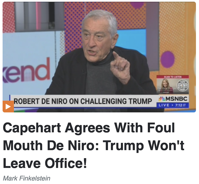 De Niro’s recurring theme was that at the end of his current term, President Trump will refuse to leave office. Co-host Jonathan Capehart, whom no one would confuse for a Raging Bull, nevertheless demonstrated his solidarity with De Niro, telling him “You and I are on the same wavelength” about that.