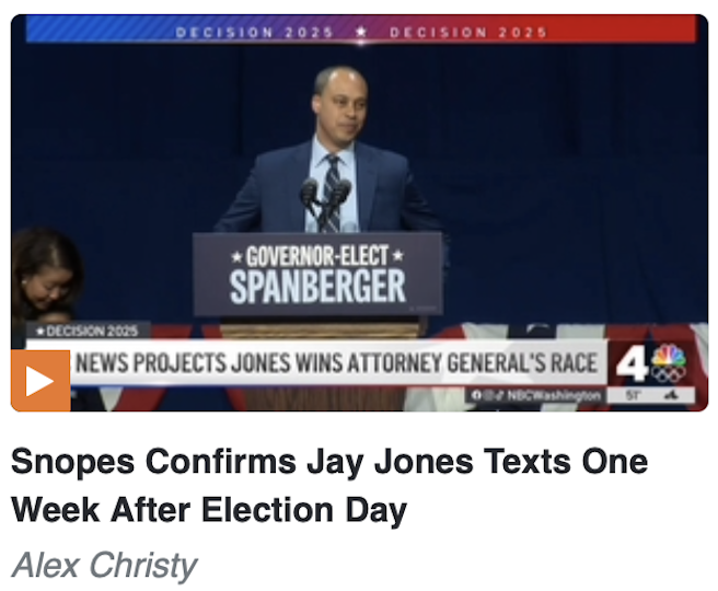 Sometimes the expression “better late than never” is not actually true. One such example came during a Tuesday Snopes article by Joey Esposito that fact-checked claims that Virginia Attorney General-elect Jay Jones “sent violent texts about GOP opponent and his children” and rated them “true” one week after Election Day.
