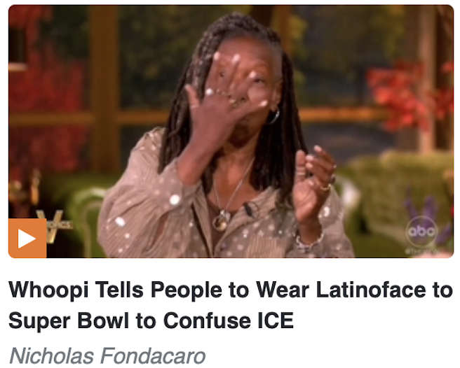 ABC News moderator Whoopi Goldberg apparently didn’t learn a lesson from her former lover Ted Danson’s controversy of wearing blackface as a white man (which she defended). During Monday’s edition of The View, Goldberg instructed people to attend the Super Bowl in 2026 while wearing Latinoface in an effort to confuse the Immigration and Customs Enforcement agents that would be at the event as part of the usual Homeland Security deployment.