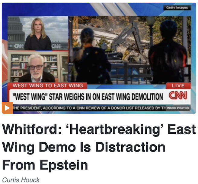 Recall that Bonilla dismissed the ballroom story as a “local zoning dispute,” and the poor guy can’t understand why the destruction of a historically significant building is a story at all. Rather, he dismissed it again as “Trump-deranged Elitist Media run brain rot.”