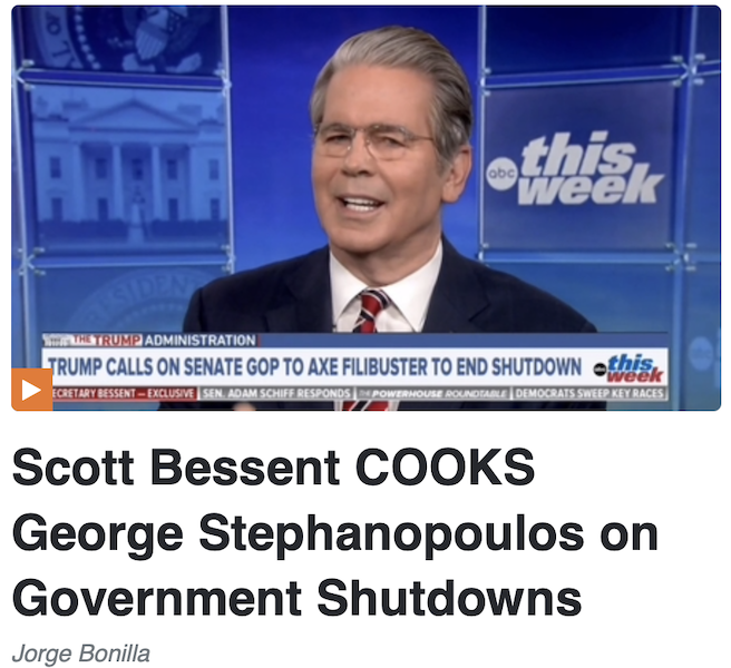 ABC’s George Stephanopoulos tried to push Treasury Secretary Scott Bessent with regard to ending the ongoing government shutdown. Instead, he was treated to an uncomfortable history lesson.
