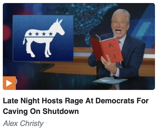 […]On Comedy Central’s The Daily Show, Jon Stewart raged, “I cannot [bleep] believe it! You had the wind at your back! Election victories all over the country… Democrats, you sold out the entire shutdown not to get what you wanted, but for a promise to not get what you wanted later. Where in The Art of War—where—hold on—where in The Art of—okay, here it is: I got it. Sun Tzu said, ‘Never press your advantage. It’s unseemly! Fighting’s hard. How ’bout a snack?’”