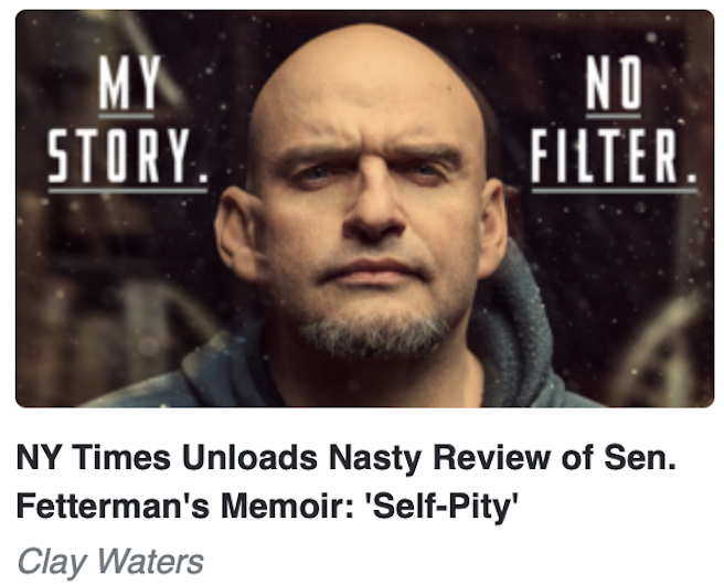 Jennifer Szalai, the nonfiction book critic for the New York Times, uncorked a nasty review of Sen. John Fetterman’s new memoir (D-PA) Unfettered in Wednesday’s edition (the review was written before Fetterman’s hospitalization after a fall). A petulant take-down which surely has nothing to do with Fetterman’s willingness to buck his Democratic Party at times, right?