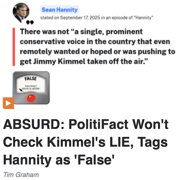 Here again, PolitiFact was perfectly partisan. There was no fact check for Kimmel’s shameless lie. But they threw a “False” flag at Fox host Sean Hannity when he suggested “I can’t find a single, prominent conservative voice in the country that even remotely wanted or hoped or was pushing to get Jimmy Kimmel taken off the air.” He meant over the last few days. PolitiFact cried “False” – because Trump had previously tweeted that untalented Kimmel shouldn’t be on the air.