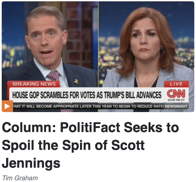 Graham appears offended by the tone of fact-checkers who fact-check conservatives. At least he admits that right-wingers like Jennings trade in “spin,” not facts — though he doesn’t explain why spin cannot be fact-checked.