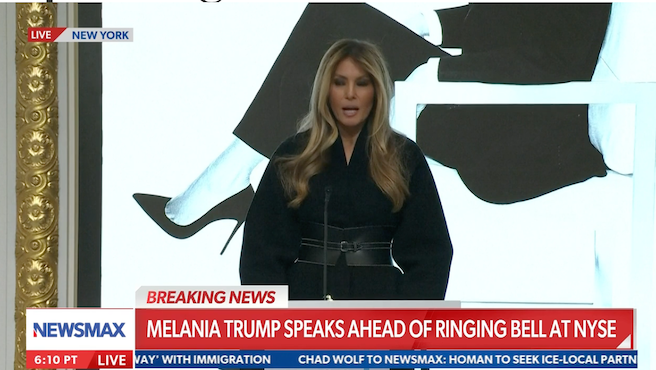 First lady Melania Trump appeared at the New York Stock Exchange on Wednesday morning, delivering remarks ahead of ringing the opening bell to highlight the upcoming “Melania” theater release, a documentary storytelling of “the 20 days leading up to the inauguration.”