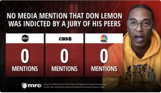 MRC analysts examined all coverage of Lemon’s arrest on the big three broadcast networks’ flagship morning (Good Morning America, CBS Mornings, and Today) and evening shows (ABC World News Tonight, CBS Evening News, and NBC Nightly News), from the morning of January 30 through the morning of February 3, 2026. Across the seven different reports about the incident, totaling just over 14 minutes, not once was it mentioned that Lemon’s arrest was not a reckless act by an out of control Justice Department, but rather the result of a grand jury indictment.