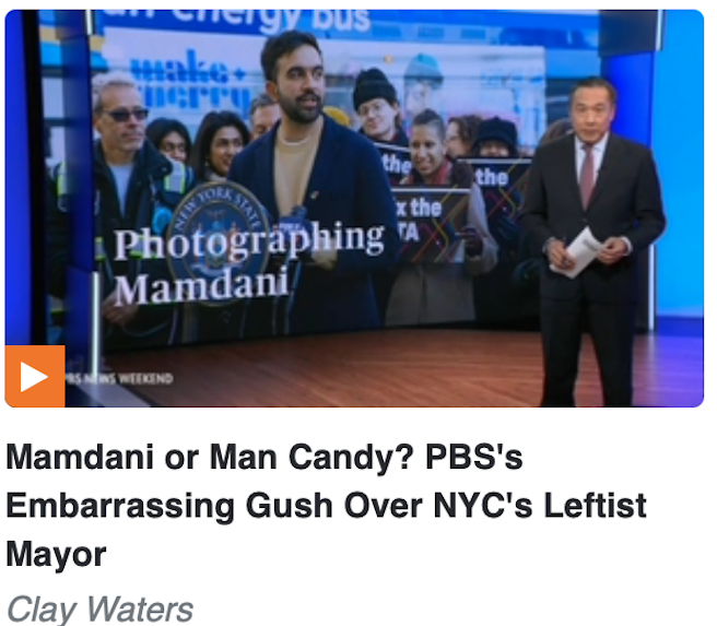 Attaining a level of journalistic integrity perhaps only previously reached by Teen Beat magazine, Sunday’s PBS News Weekend gushed over man-candy Mamdani’s “remarkable rise” to mayor with his campaign photographer, Kara McCurdy. It wasn’t exactly a segment designed to quiet the complaints of ideological bias at PBS or win its public funding back.