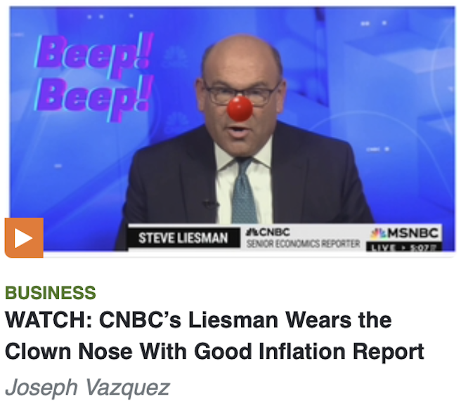 It’s one of the most amusing aspects of MRC Business’s day-to-day routine when staff watch liberal media talking heads forced to eat crow over their blind adamancy that President Donald Trump is going to wreck the economy. CNBC senior economics reporter Steve Liesman is the latest to be found wearing the clown nose.