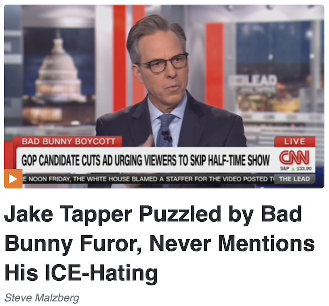 […]Could Bunny’s verbal attacks on ICE have something to do with it? Tapper and his panel continued to ignore that, as Tapper then asked Democrat Strategist Chuck Rocha: “What do you make of this latest battle in the culture wars?” By not getting into the actual substance, Tapper makes it sound like it’s just white rappers in English vs. Latino rappers in Spanish.
