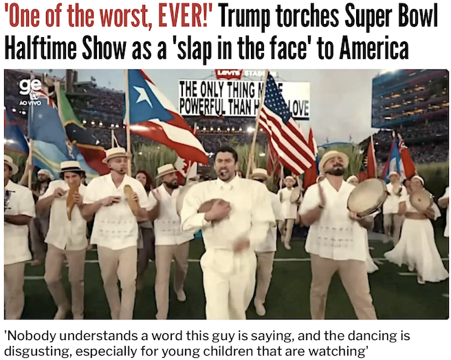 “The Super Bowl Halftime Show is absolutely terrible, one of the worst, EVER!” Trump exclaimed on Truth Social.