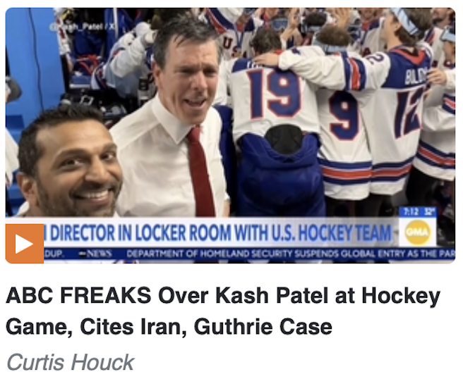 Having spent the Winter Olympics alternately freaking out that athletes were asked about politics and also that a U.S.-trained athlete who’s competing for China was not asked about politics, the Media Research Center moved on to a more pedestrian complaint: that the antics of FBI director Kash Patel partying with the U.S. Olympics hockey team was reported. Curtis Houck groused in a Feb. 23 post:
